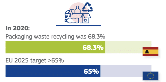 European Union (EU) regulations set three targets for the reuse and recycling of waste: to recycle 65% of packaging waste by 2025, to recycle 55% of municipal waste by 2025, and to reduce landfilling of municipal waste to a rate of less than 10% by 2035. The data published by the Commission, which reflect Spain’s performance in 2020, show that the State only passes the first directive, recycling 68.3% of packaging waste. In the other two rates, Spain falls far short of both targets, recycling only 36.4% of municipal waste and dumping 52% of that waste.