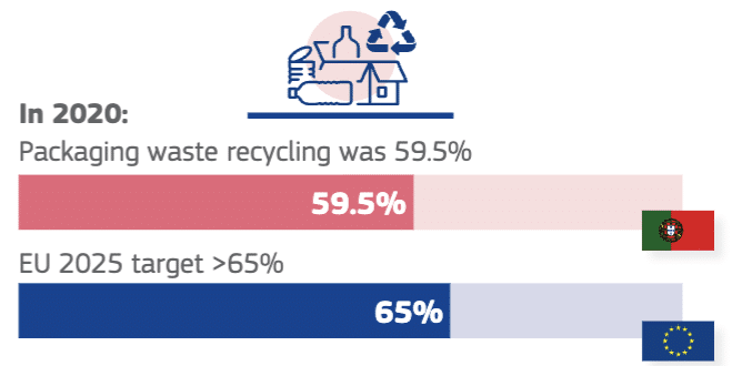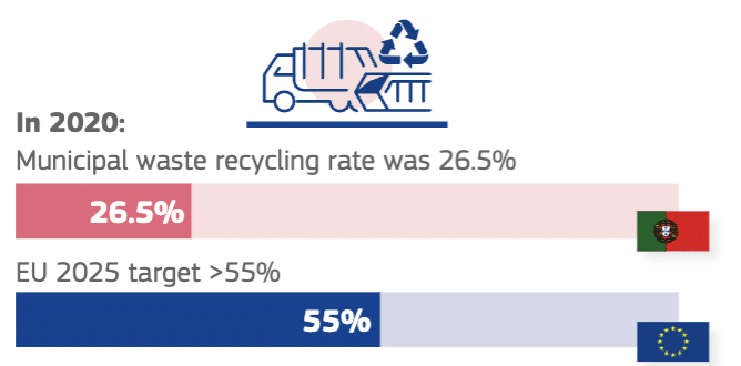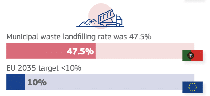 The case of Portugal is more similar to that of Spain, although it does not meet any of the parameters established by the Commission. The country is on track to meet the waste recycling rate, as with a percentage of 59.5%, it is 5 points away from meeting the EU target. However, Portugal only recycles 26.5% (the target is > 55%) of municipal waste and dumps 47.5% of this waste (the target is < 10%).