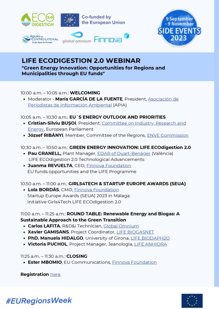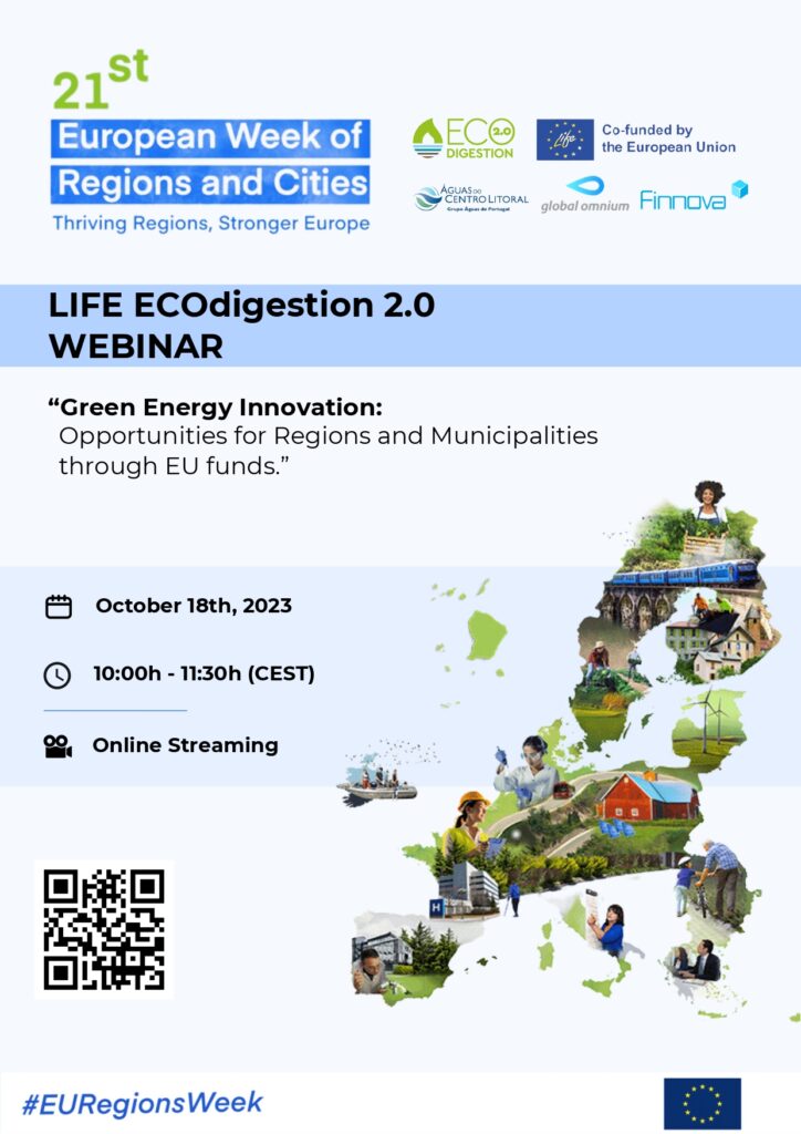 16/10/2023, Bruselas. Desde el proyecto europeo LIFE ECOdigestion 2.0 os invitamos a uniros a nosotros en el Webinar Online LIFE ECOdigestion 2.0 titulado: «Green Energy Innovation: Opportunities for Regions and Municipalities through EU funds» en el marco de la Semana Europea de las Regiones y Ciudades 2023 (#EURegionsWeek).